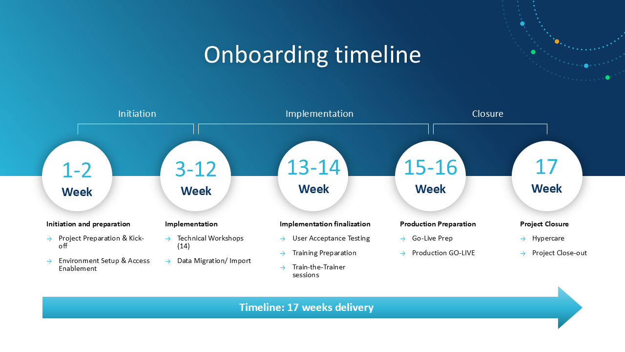 Nuvolo’s Core Package utilizes a standardized implementation approach structured to ensure clarity, efficiency, and consistency throughout the project lifecycle. The initiation phase centers on setting expectations by reviewing the established scope of work, confirming deliverables, assigning roles, and detailing the implementation steps as outlined in the Order Form. Given the pre-defined scope of work, planning concentrates on organizing tasks according to the established methodology, setting specific milestones, and assigning resources to effectively support each phase of the project, which is expected to take seventeen (17) weeks from project kickoff to production launch.